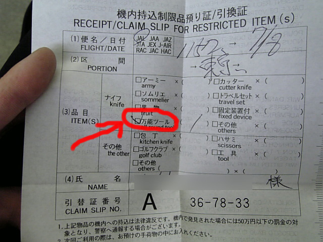 自慢をする為だけに、例の刃物を飛行機で運んでみました。